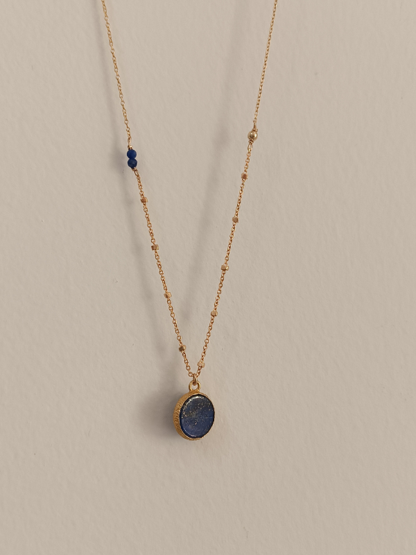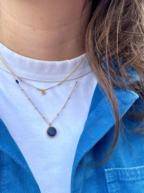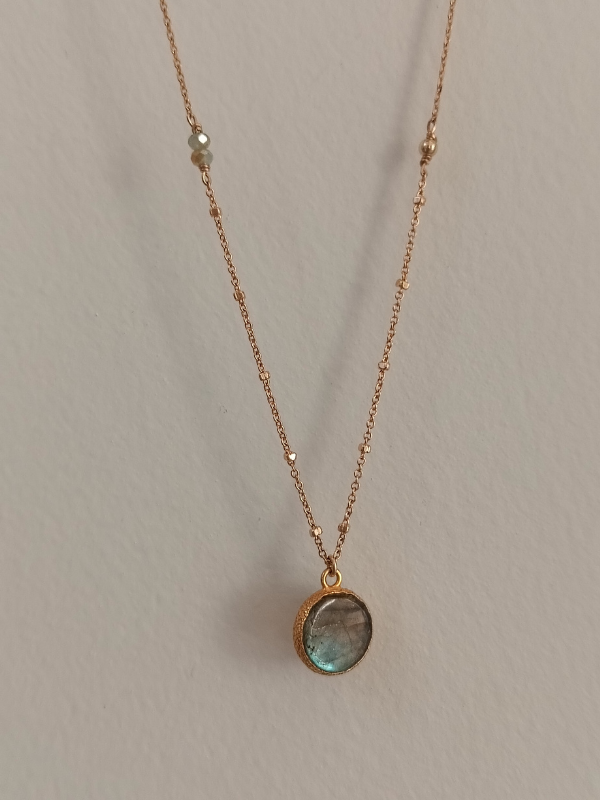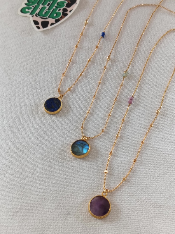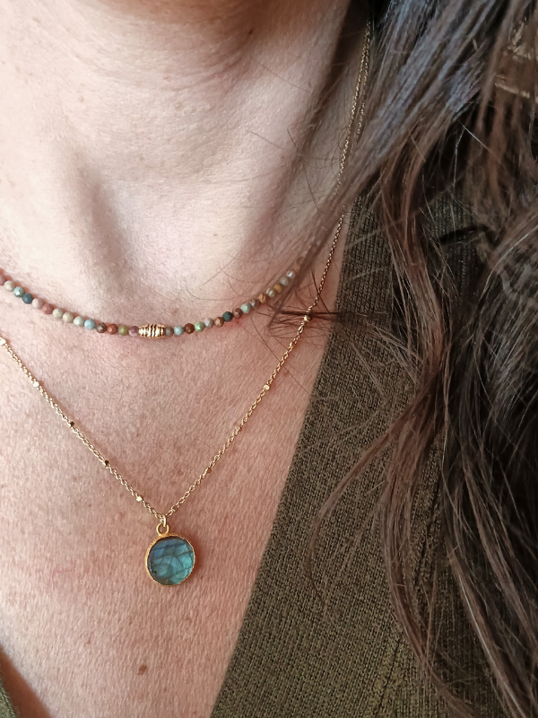 Serti d'un joli médaillon rond serti d'une pierre naturelle et cerclée d'or martelé, la touche colorée délicate qui vous suit au quotidien.